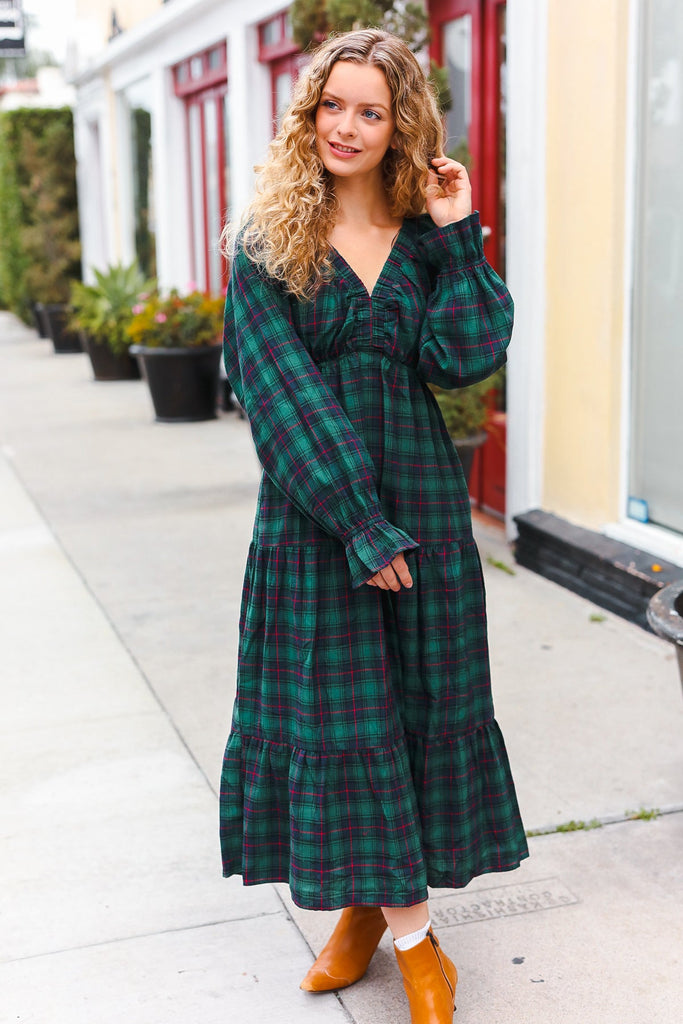 All I Want Hunter Green Plaid Elastic V Neck Tiered Maxi Dress - Onlin – Pretty as a Peach Boutique