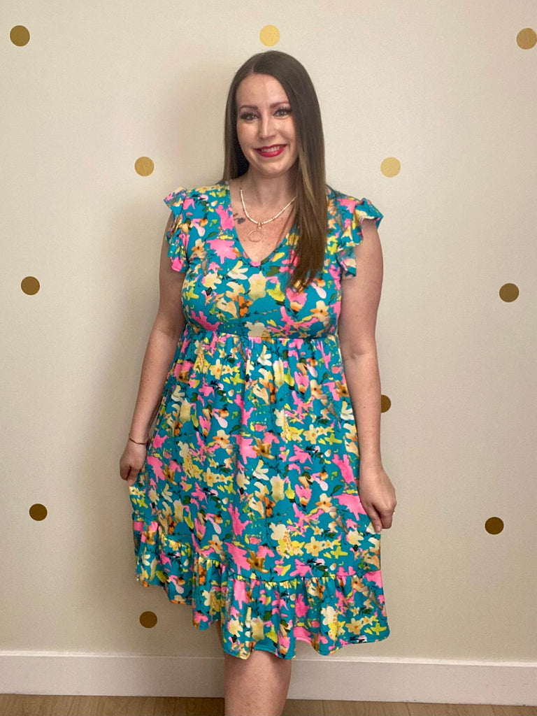 FINAL SALE Aqua Multicolor Floral Print Pocket Dress