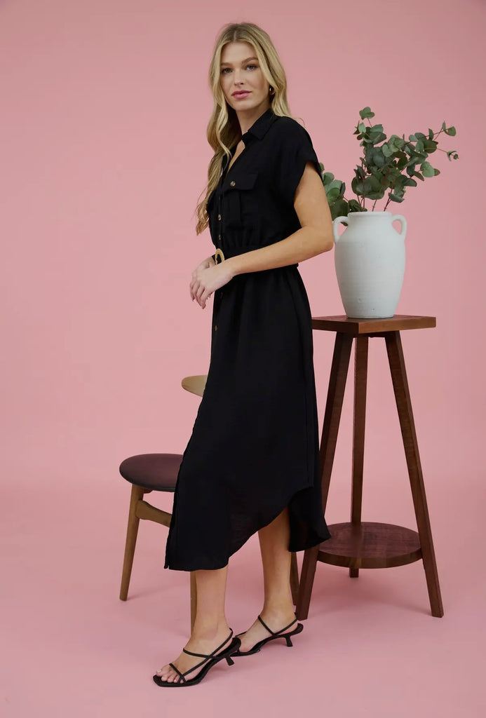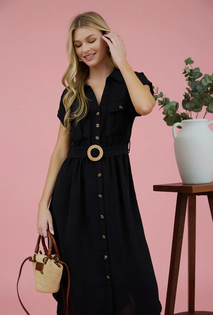 Black Collared Button Down Belted Midi Dress – Pretty as a Peach Boutique