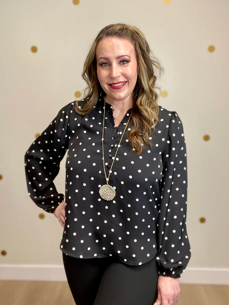 Classic with a playful twist — our Black Polka Dot Button Top is a timeless piece you’ll love styling again and again. Featuring a charming polka dot print, long sleeves, and a button-front design, this top brings just the right mix of sophistication and fun. Made with a lightweight, non-stretchy fabric, it drapes beautifully while keeping its shape.