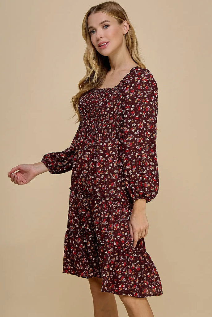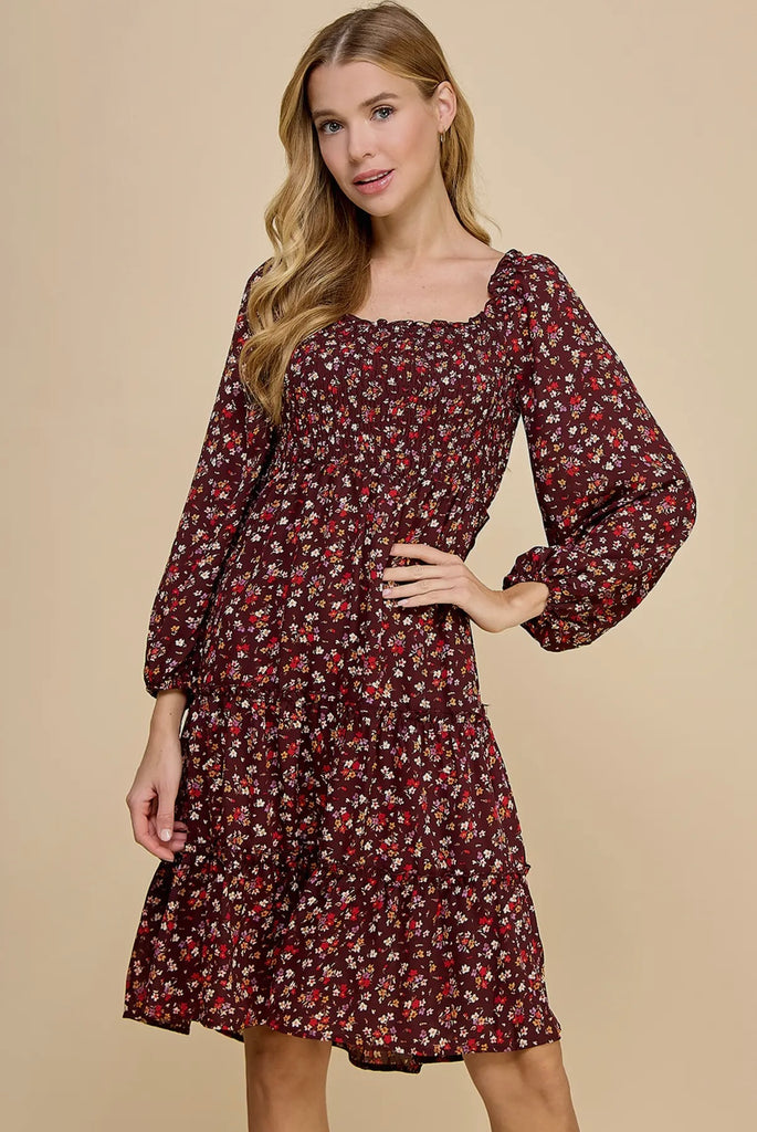 Brown Floral Smocked Tiered Dress