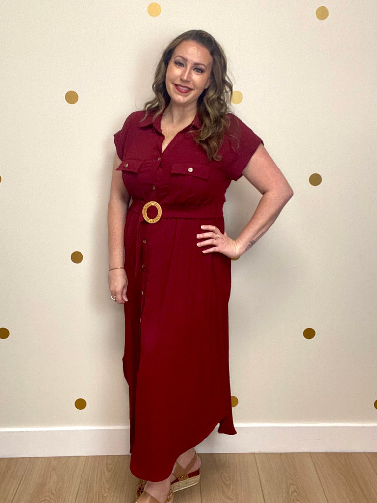 This chic midi dress features a collared neckline, button-down front, and a matching belt that cinches the waist for a polished silhouette. The burgundy hue adds warmth and sophistication, while the fitted bust and looser body create a comfortable, flattering fit you can wear all day. S (4/6), M (8/10), L (12/14), 1XL (16/18), 2XL (20), 3XL (22). Elizabeth is wearing her typical size medium.