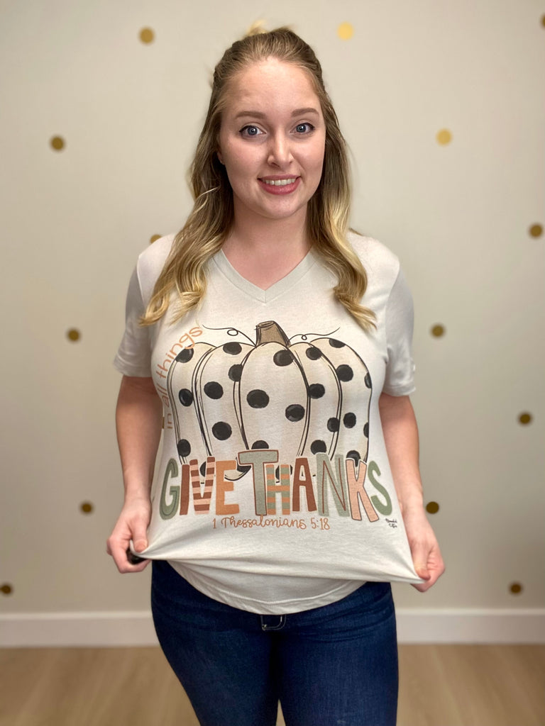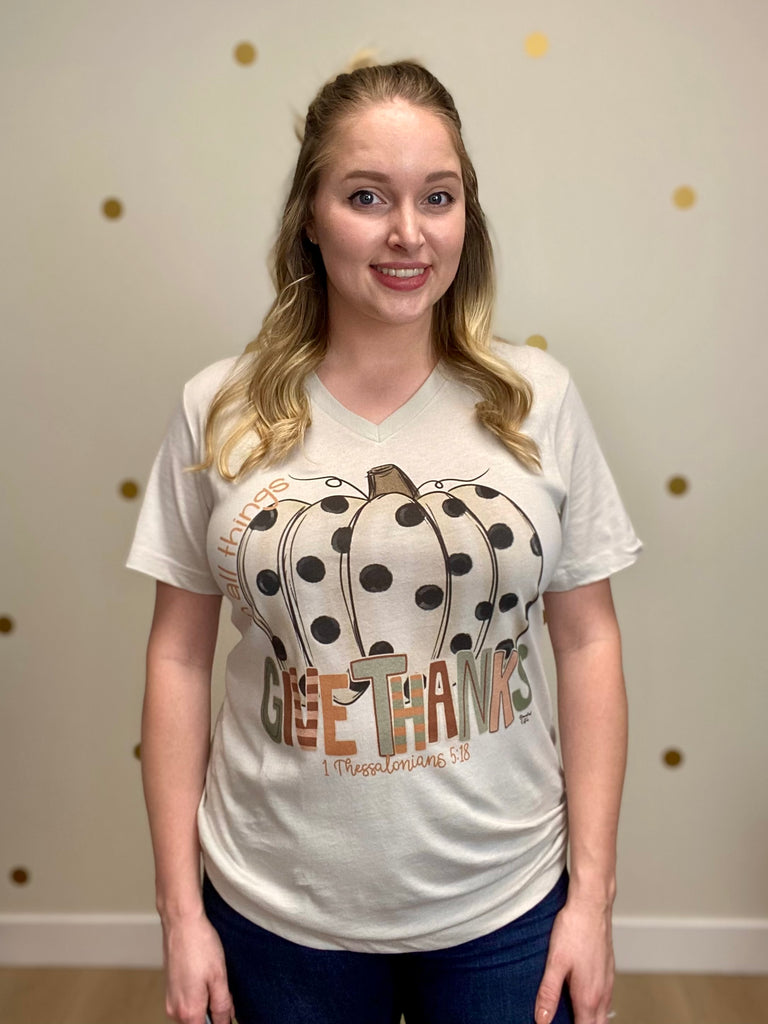 In all things, give thanks! The perfect fall tee to show off your love for fall and faith. Pair it with a cardigan or tied over a dress for a great fall look! This tee fits true to size. Danielle is wearing her typical size medium.