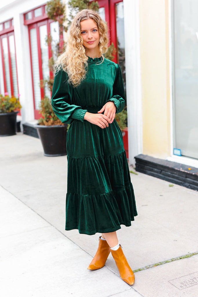 Holiday Dreaming Hunter Green Velvet Mock Neck Smocked Waist Dress - Online Only!
