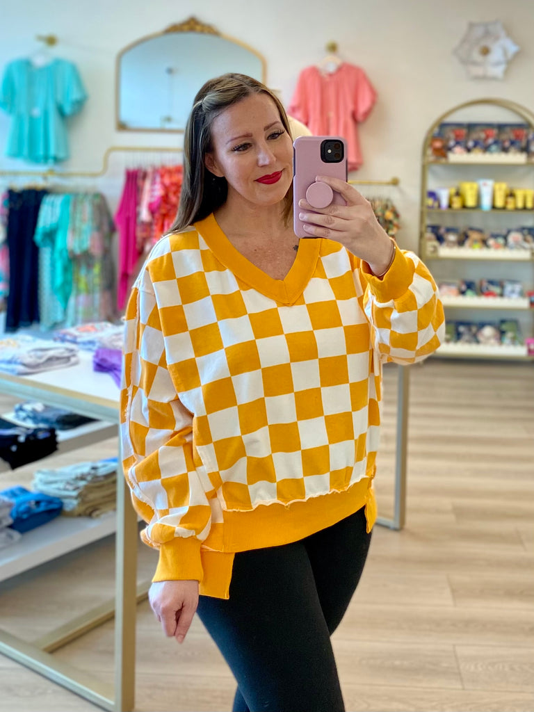 Cheer on the Vols in standout style with our Oversized Orange Checkered Game Day Sweatshirt! This eye-catching sweatshirt features a bold orange checkered pattern with game day vibes written all over it. Designed with a flattering V-neckline, raw edge seam details, and a relaxed, oversized fit, it’s as comfy as it is spirited. The sweatshirt also has POCKETS!!!