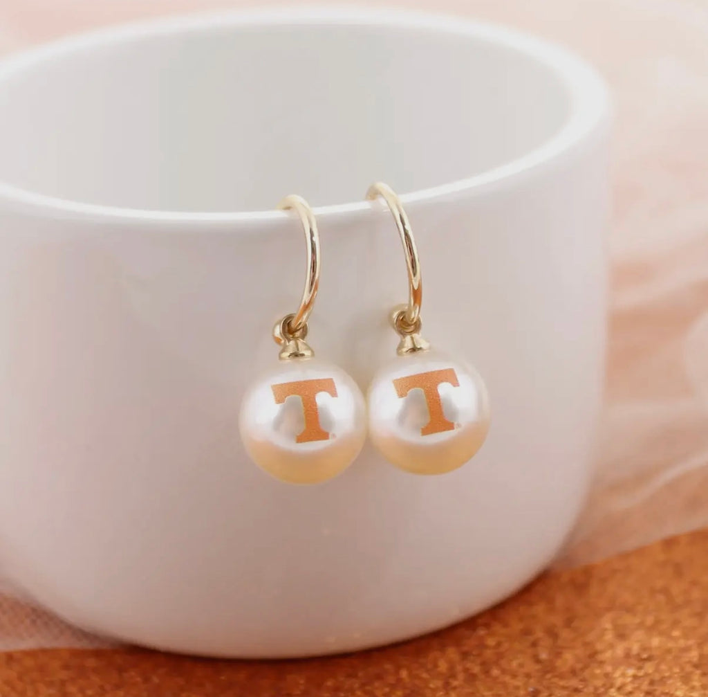 Show your Vols pride in style with our Tennessee Logo Pearl Hoop Earrings.