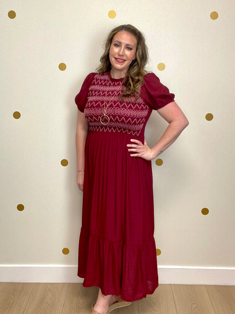 This gorgeous midi dress features an elegant wine hue, delicate smocked detailing across the bodice, and charming puff sleeves that add a touch of vintage-inspired femininity. Fitted in the bust and looser through the body, it offers a silhouette that’s both flattering and comfortable. S (4/6), M (8/10), L (12/14). Elizabeth is wearing her typical size medium.