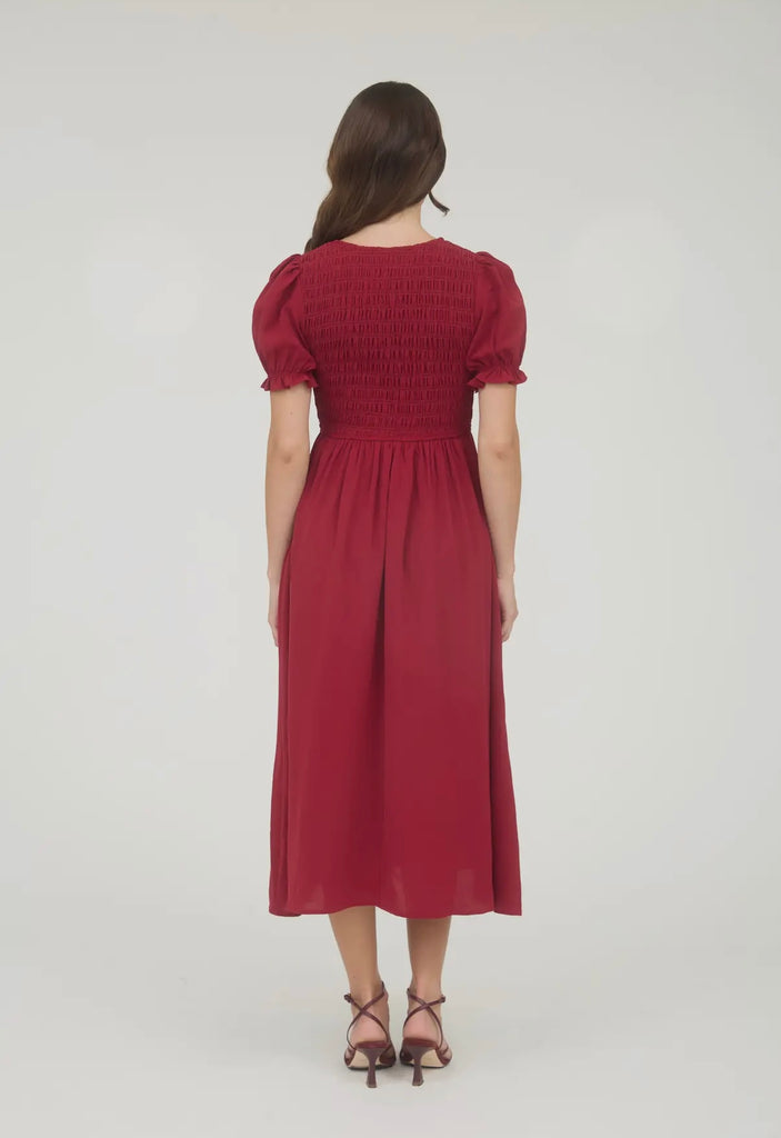 Chic and charming with a timeless twist — our Wine Smocked Tie Puff Sleeve Midi Dress is a style you’ll reach for again and again.