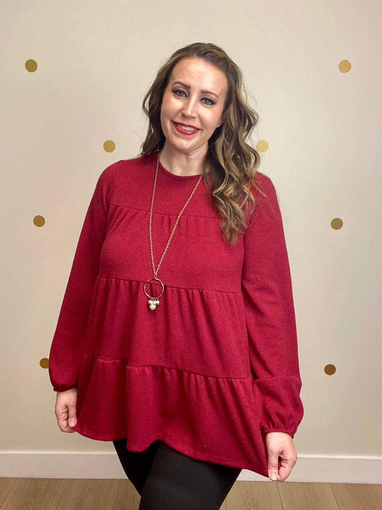 Designed in a rich wine hue, this top features a tiered silhouette that flows effortlessly for a touch of feminine charm. Fitted in the bust and looser through the body, it offers both a flattering fit and all-day comfort. The top is an oversized, loose fit. S (4/6), M (8/10), L (12/14), 1XL (16/18), 2XL (20), 3XL (22). Elizabeth sized down to a size small.